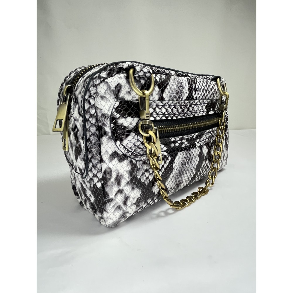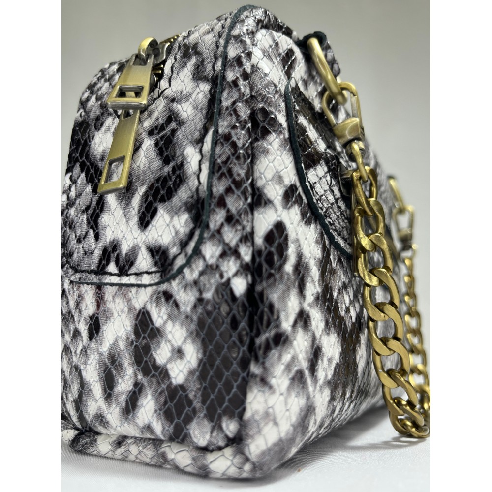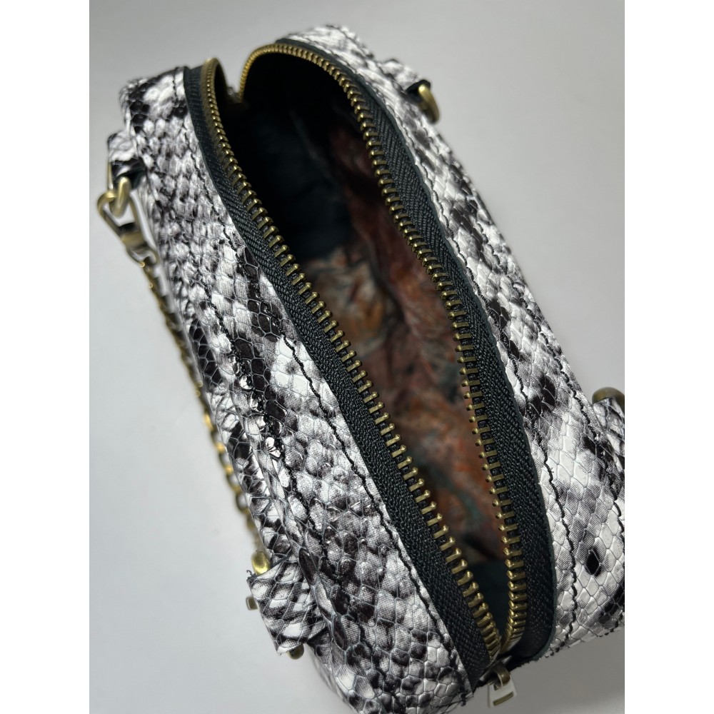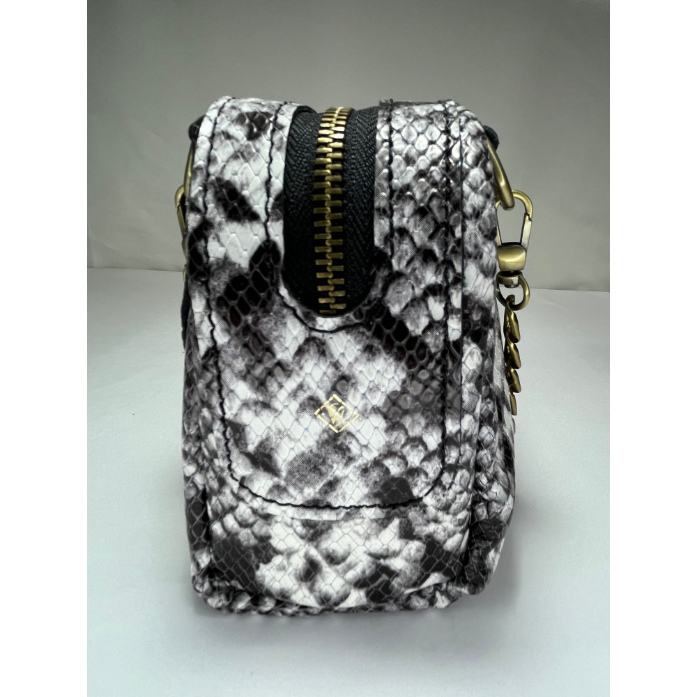 MONEL Snake Beyaz, siyah-beyaz yılan desenli yüzeyiyle güçlü kontrast sunan dikkat çekici bir modeldir. El yapımı yapısı ve kompakt formuyla modern ve iddialı bir görünüm taşır.