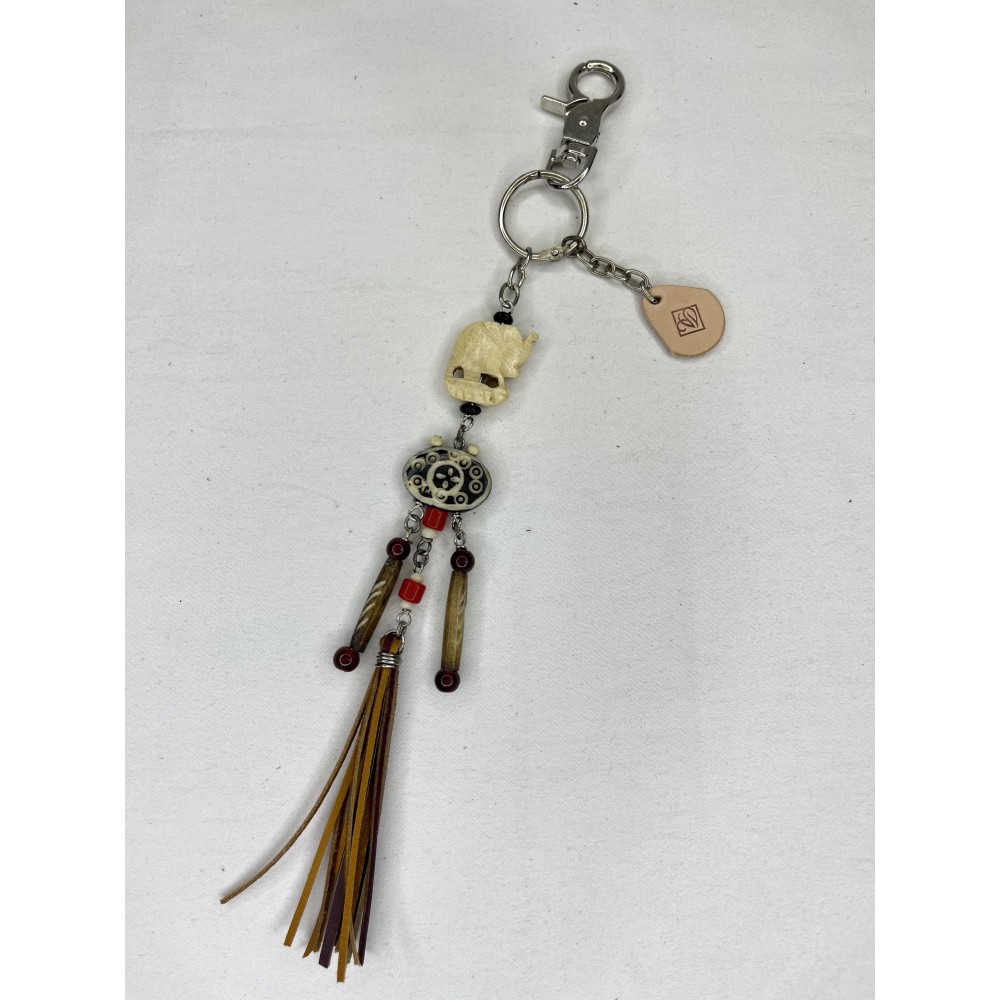 Etnik desenli kemik boncuklar, toprağın enerjisini yansıtırken, sarı ve bordo tonlardaki deri püskül, doğallığın ve özgürlüğün sıcak dokusunu ekler.