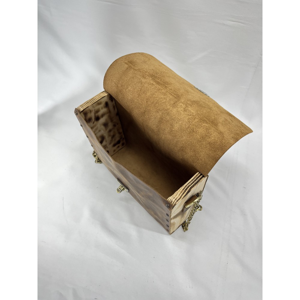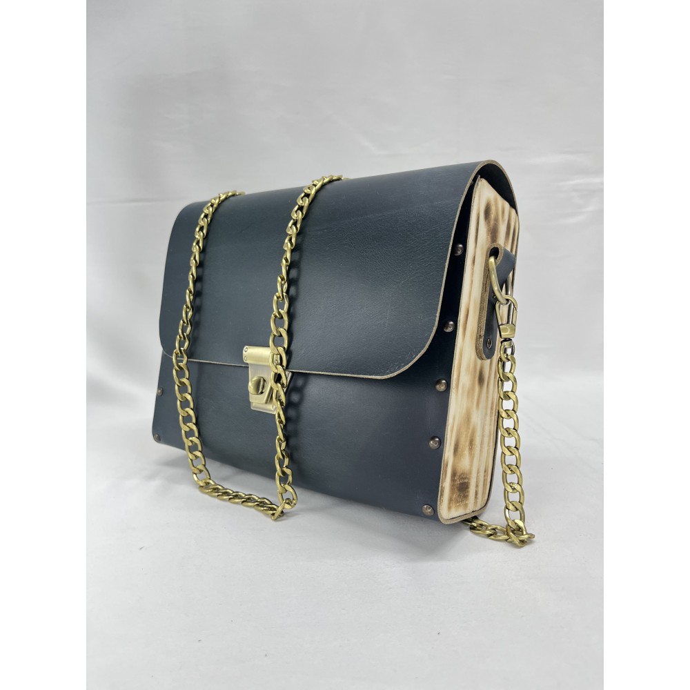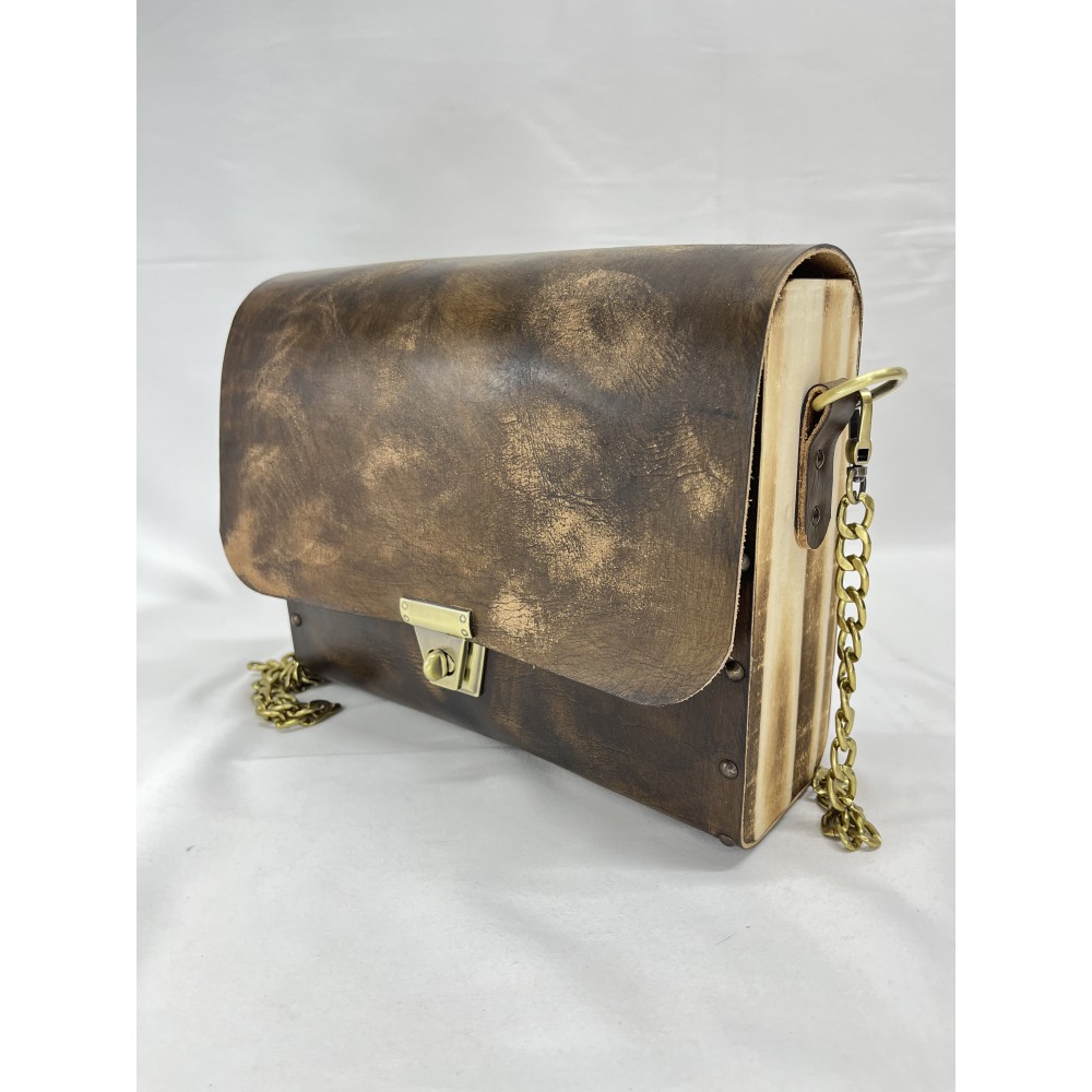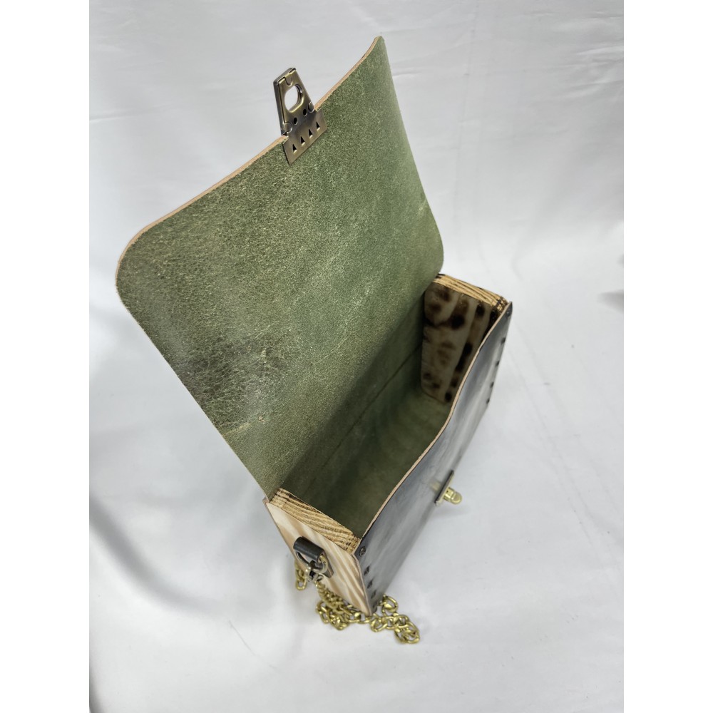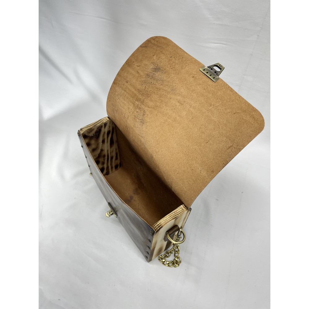 Ahşap kenar detayları, özel yakma işlemiyle antik bir görünüm kazanmış; bu da çantaya hem rustik hem de lüks bir karakter kazandırmıştır.