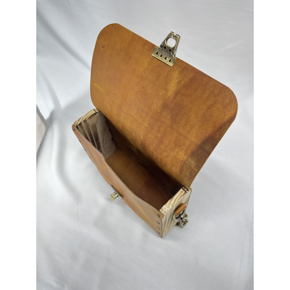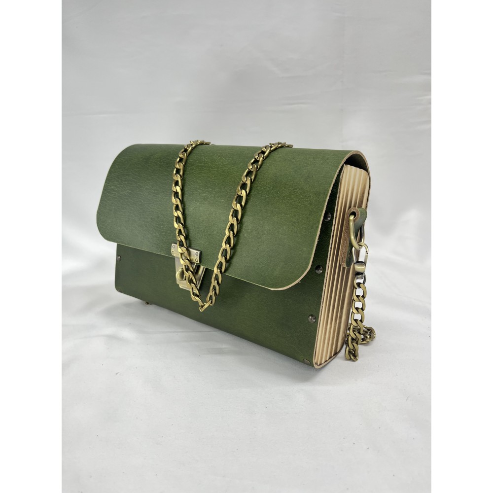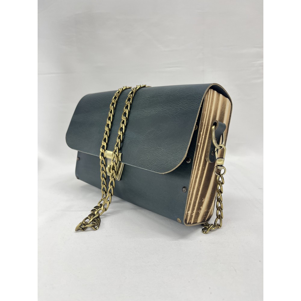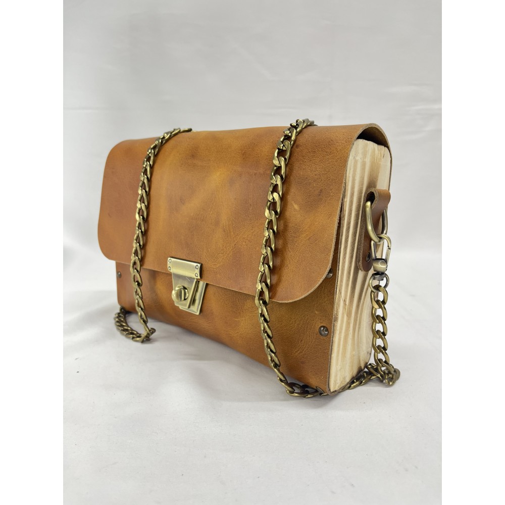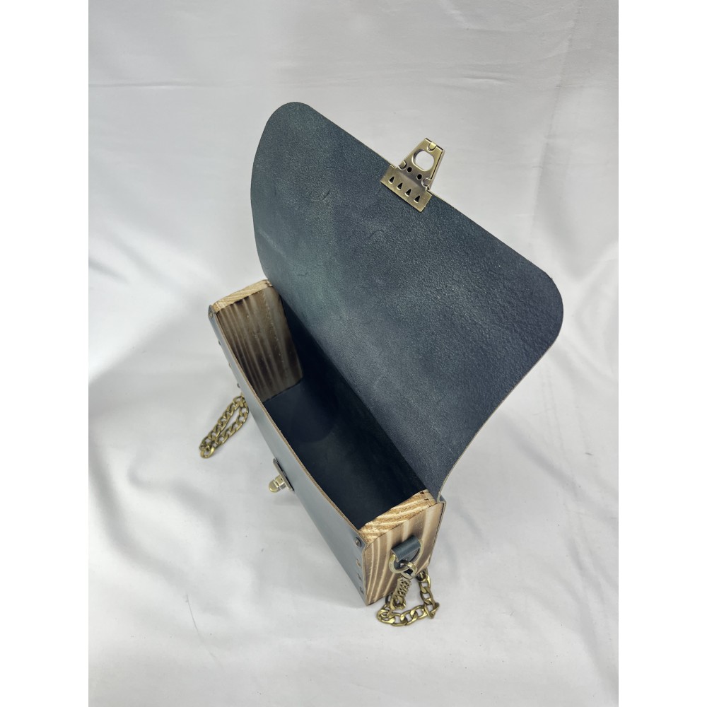 Ahşap kenar bölümleri, özel yakma işlemiyle antik bir görünüm kazanmış; böylece çanta, rustik bir sıcaklıkla modern bir çizgiyi birleştirir.